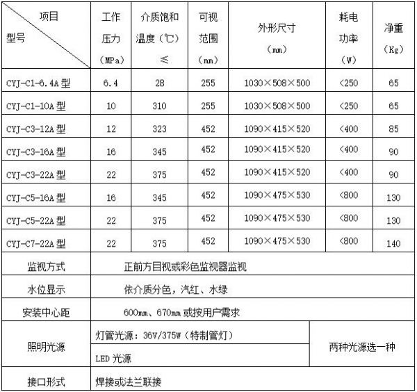 `CYJ型窗式高壓、超高壓彩色液位計是用于各發(fā)電廠、石油化工行業(yè)及各工礦企業(yè)的蒸汽鍋爐或其它壓力容器監(jiān)測水位的一次就地直讀儀表。它是在總結(jié)國內(nèi)外各種透射式雙色水位計優(yōu)點基礎(chǔ)上新研制的長窗式高壓、超高壓雙色水位計,用汽紅水綠顯示液位,無水全紅、滿水全綠。紅綠色界面即為實際水位??稍诂F(xiàn)場直接觀察也可以配我公司生產(chǎn)的彩色工業(yè)電視監(jiān)視系統(tǒng),在控制室內(nèi)的監(jiān)視器熒屏上遠程監(jiān)測現(xiàn)場實際水位。它與其它雙色水位計相比較,具有如下幾種特點: